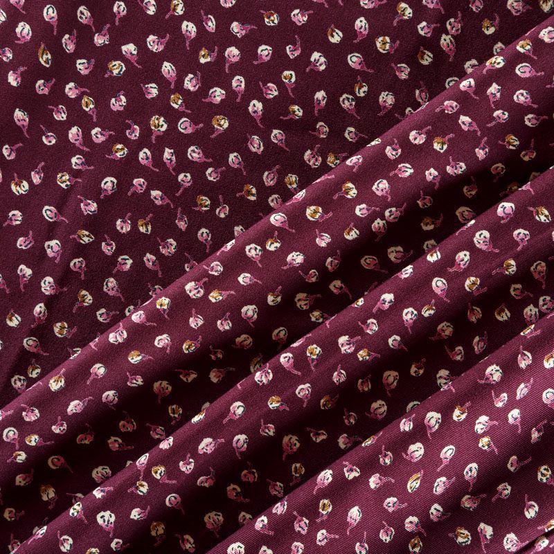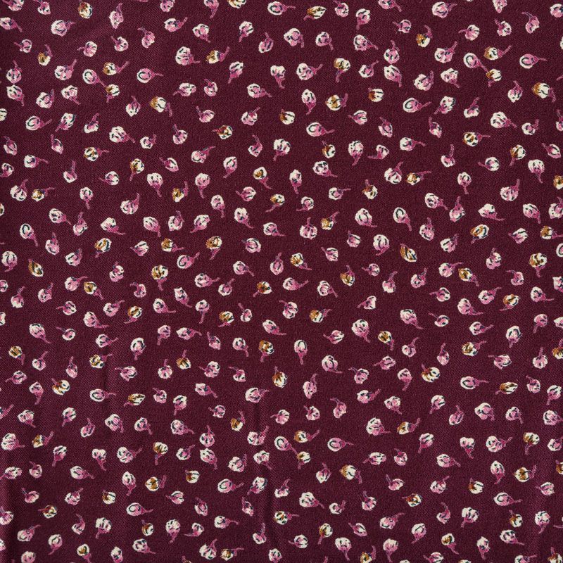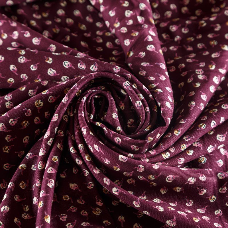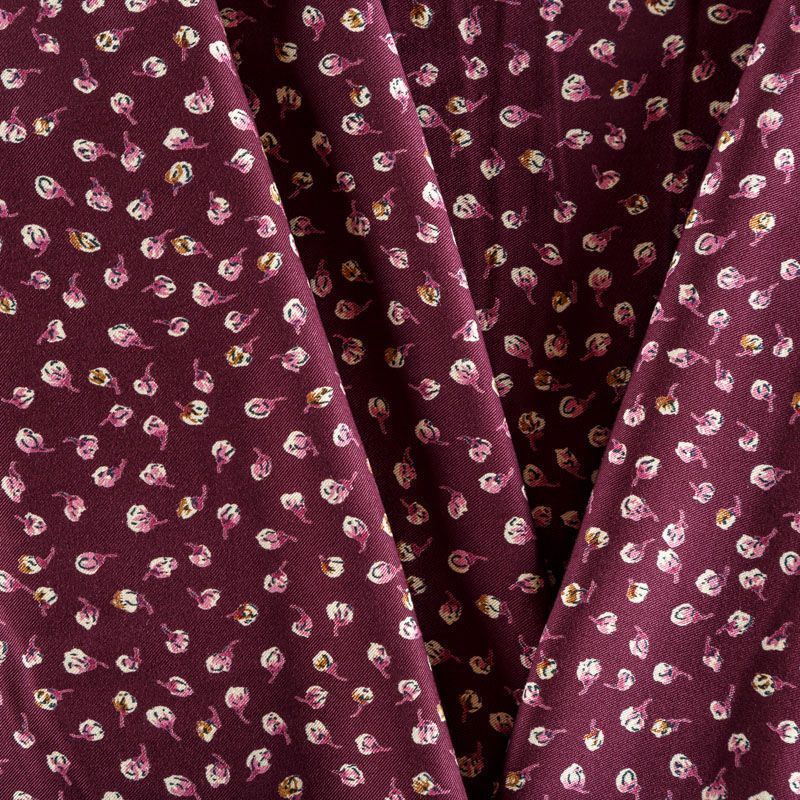 Плотная и мягкая ткань бордового оттенка с ярким мелкоцветом, имеет саржевое плетение и характерный диагональный рубчик на поверхности. Отлично сохраняет форму, не сильно мнется и не деформируется в процессе эксплуатации. Красиво ложится в складки, поэтому прекрасно подойдет на длинные драпированные юбки и платья, на свободные брюки или шорты, топы, комбинезоны, а также для домашней одежды.