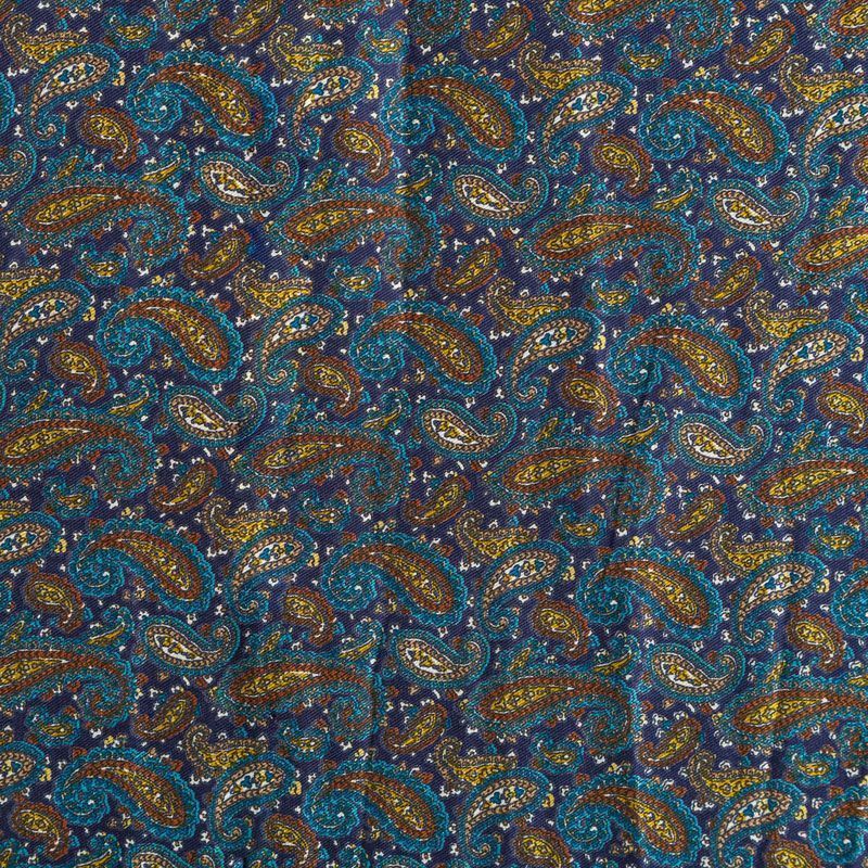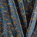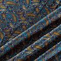 Плотная и мягкая ткань синего оттенка с богатым узором пейсли в желто-голубых тонах, имеет саржевое плетение и характерный диагональный рубчик на поверхности. Отлично сохраняет форму, не сильно мнется и не деформируется в процессе эксплуатации. Красиво ложится в складки, поэтому прекрасно подойдет на длинные драпированные юбки и платья, на свободные брюки или шорты, топы, комбинезоны, а также для домашней одежды.