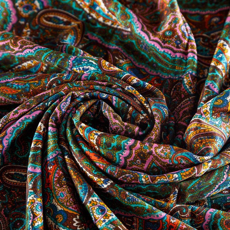 Плотная и мягкая ткань сливового оттенка с богатым узором пейсли, имеет саржевое плетение и характерный диагональный рубчик на поверхности. Отлично сохраняет форму, не сильно мнется и не деформируется в процессе эксплуатации. Красиво ложится в складки, поэтому прекрасно подойдет на длинные драпированные юбки и платья, на свободные брюки или шорты, топы, комбинезоны, а также для домашней одежды.