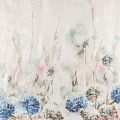 Ткань изготовлена изо льна методом полотняного переплетения. Она прочная, достаточно плотная,  держит форму и обладает ярко выраженной фактурой. Эта ткань подойдет для пошива штор, римских штор, предметов столового белья. Её можно использовать для декора интерьера загородного дома или веранды. На расстоянии 1 м от низа тюля расположен принтованный акварельный рисунок в сине-розовых оттенках.
