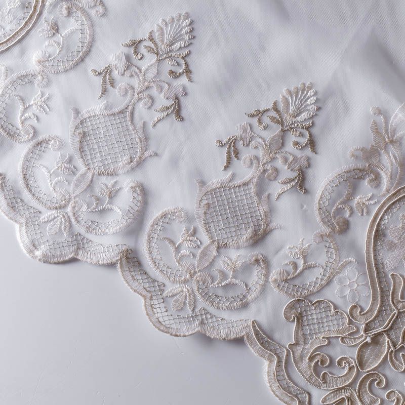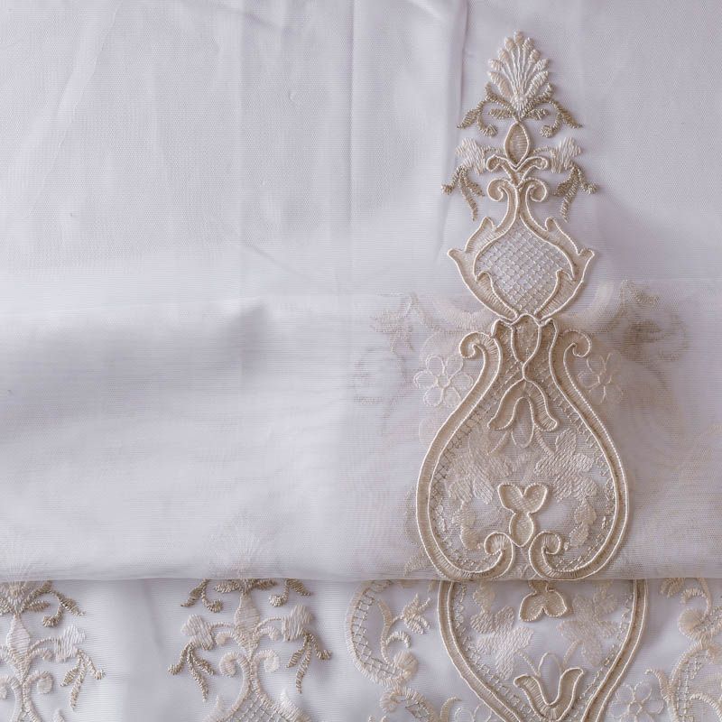Сетка с вышивкой – это роскошный элемент дизайна, который преобразит любое помещение. Она отлично пропускает воздух, поэтому быстро сохнет после стирки. Прочная, ткань прослужит долго. Выдерживает большое количество стирок. Легкая, фактура ткани практически невесома, поэтому можно не опасаясь крепить ее даже на самый тонкий карниз. Сетка с вышивкой – это роскошный элемент дизайна, который преобразит любое помещение. Она отлично пропускает воздух, поэтому быстро сохнет после стирки. Прочная, ткань прослужит долго. Выдерживает большое количество стирок. Легкая, фактура ткани практически невесома, поэтому можно не опасаясь крепить ее даже на самый тонкий карниз. Тюль украшен  ажурным купоном бежевого оттенка с добавлением люрексной нити на высоту 75 см, без утяжелителя, край фигурный.