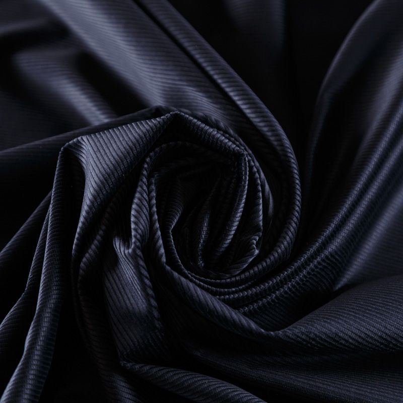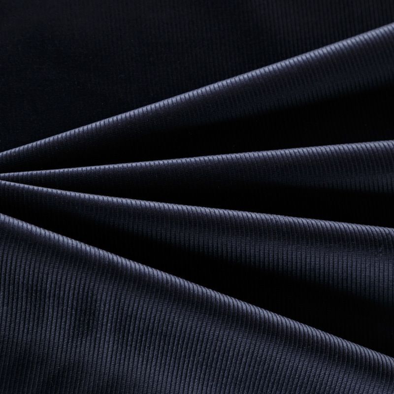 Итальянский костюмно-плательный вельвет из хлопка в черном оттенке. Очень приятный тактильно, поверхность бархатистая, рубчик средней ширины, тянется за счет эластана в составе, не просвечивает. Подойдет для пошива костюма, платья, юбки, брюк, верхней одежды.