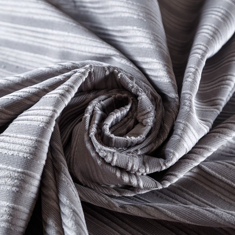 Итальянский костюмно-плательный вельвет из хлопка в сером оттенке. Очень приятный тактильно, поверхность бархатистая в чередующийся мелкий и широкий мягкий рубчик, не тянется, держит форму, не просвечивает. Подойдет для пошива костюма, жакета, платья, сарафана, юбки или брюк.