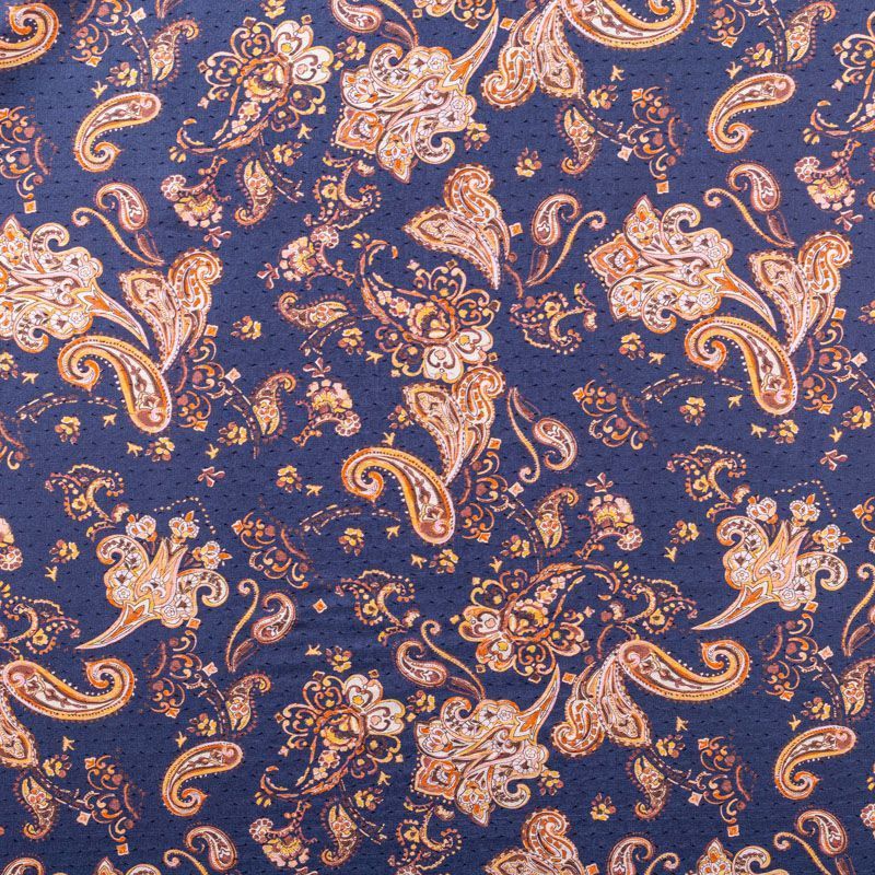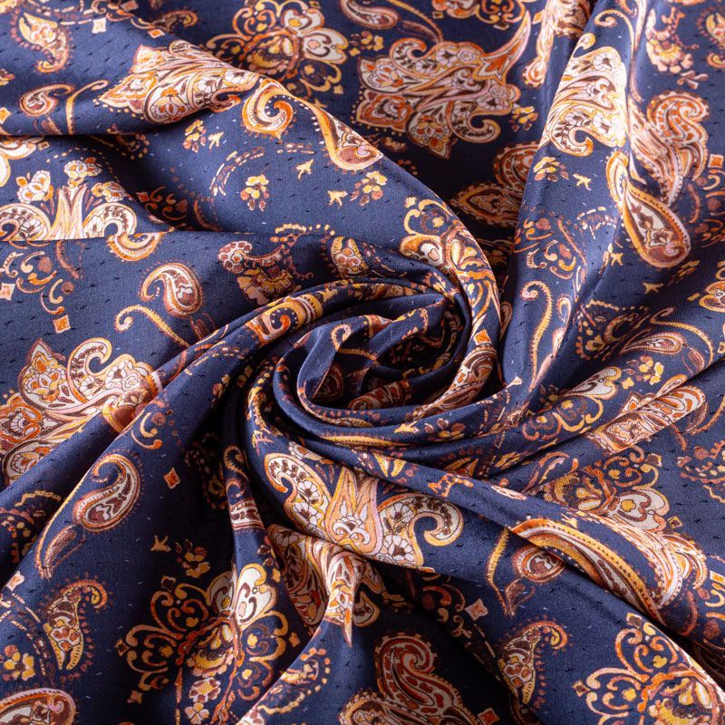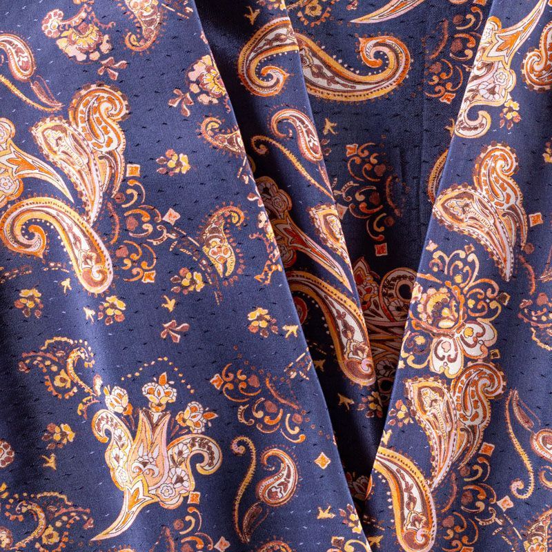 Итальянская плательно-блузочная вискоза с принтом пейсли в жедто-коричневых оттенках на темно-синем фоне декорирована мелкими атласными жаккардовыми вкраплениями. Ткань очень пластичная, отлично драпируется и струится, мягкая и приятная на ощупь, не просвечивает. Прекрасно подойдет для пошива платья, топа, блузки, юбки, сарафана, летнего костюма.