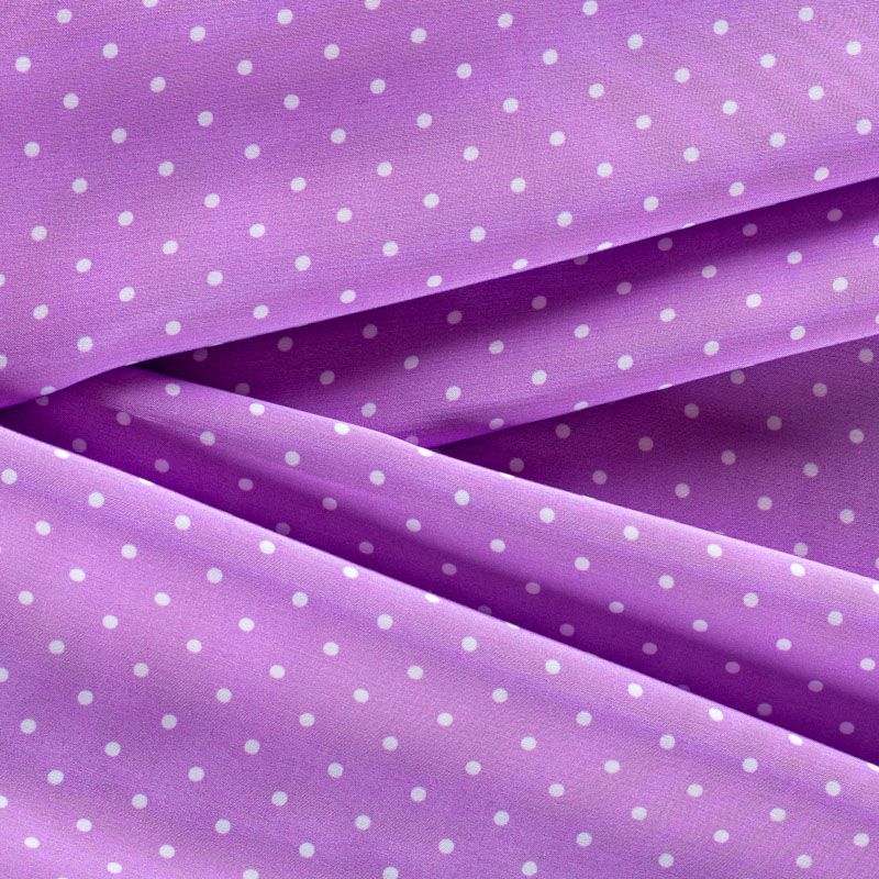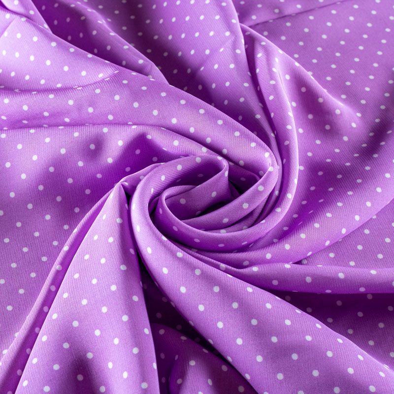 Плательно-рубашечная итальянская вискоза цвета аметиста с принтом в мелкий горошек. Натуральная, дышащая ткань, очень приятная к телу, отлично драпируется, струится, не просвечивает. Хорошо подойдет для пошива платьев, рубашек, платьев-рубашек, блуз, юбок, брюк, летних костюмов, пыльников, детской одежды.