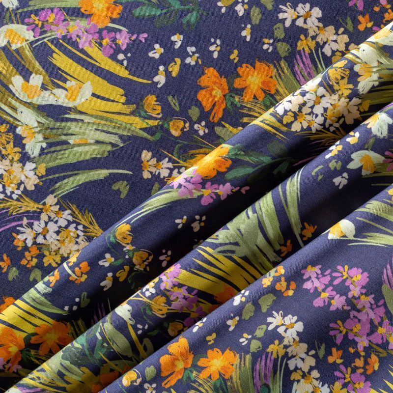Плательно-рубашечная итальянская вискоза темно-синего оттенка с летним цветочным принтом . Натуральная, дышащая ткань, очень приятная к телу, отлично драпируется, струится, не просвечивает. Хорошо подойдет для пошива платьев, рубашек, платьев-рубашек, блуз, юбок, брюк, летних костюмов, пыльников, детской одежды.