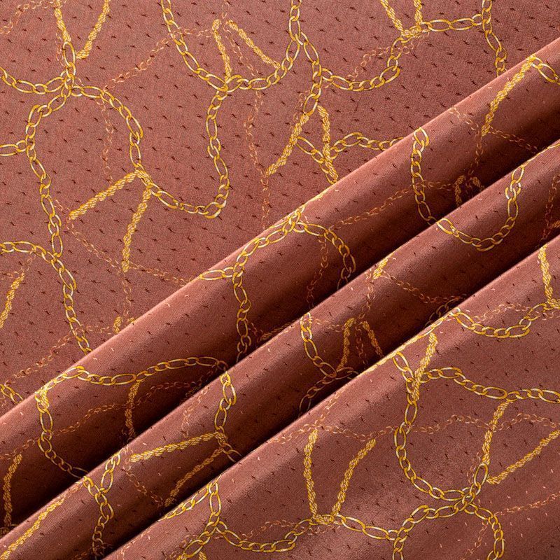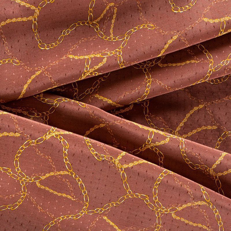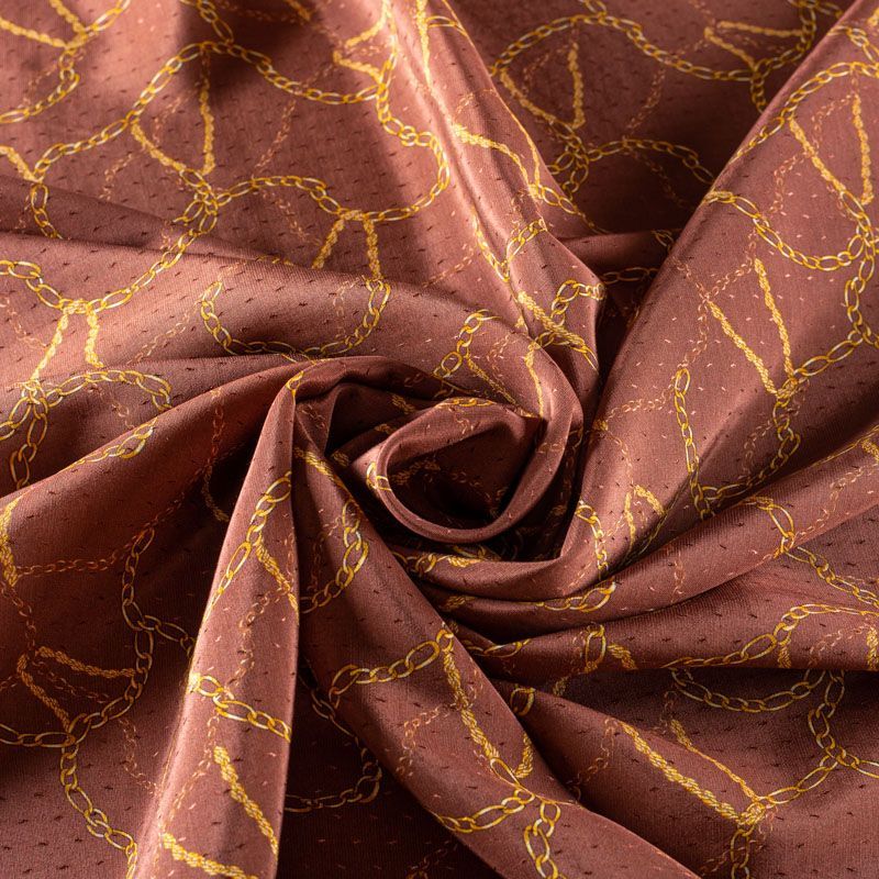 Итальянская жаккардовая вискоза оттенка корицы с актуальным принтом в виде цепочек. Ткань тонкая, слегка просвечивает, отлично драпируется и струится, приятная на ощупь. Прекрасно подойдет для пошива платья, сарафана, топа, блузки, рубашки, юбки, пижамного костюма.