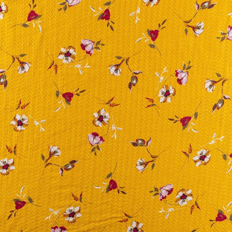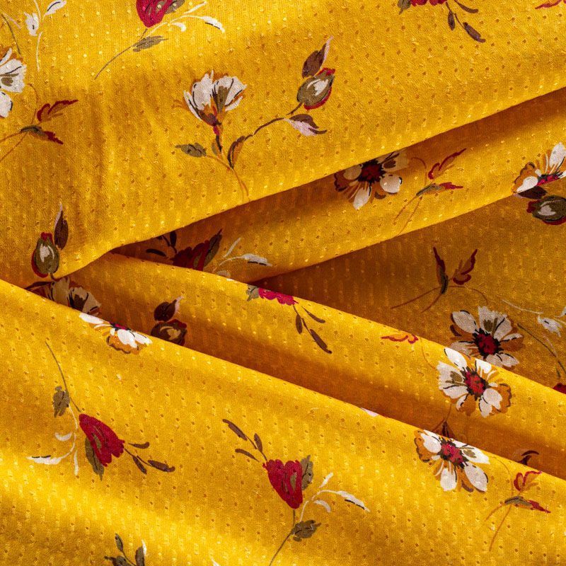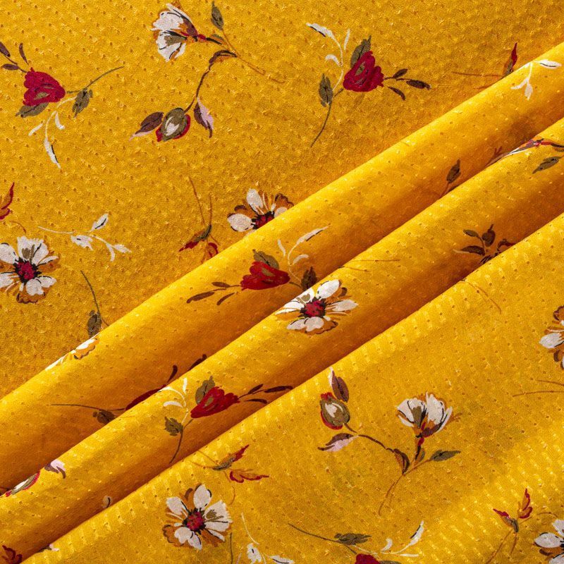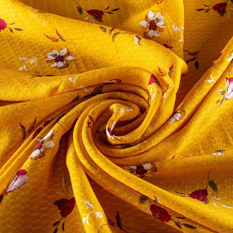 Итальянская жаккардовая вискоза шафранового оттенка с мелким цветочным принтом . Ткань тонкая, слегка просвечивает, отлично драпируется и струится, приятная на ощупь. Прекрасно подойдет для пошива платья, сарафана, топа, блузки, юбки, пижамного костюма.