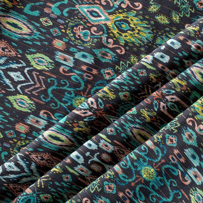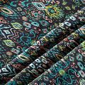 Итальянская плательно-блузочная вискоза со сложным этническим мотивом на черном фоне декорирована тонкой люрексовой нитью. Ткань очень пластичная, отлично драпируется и струится, мягкая и приятная на ощупь, не просвечивает. Прекрасно подойдет для пошива платья, топа, блузки, юбки.