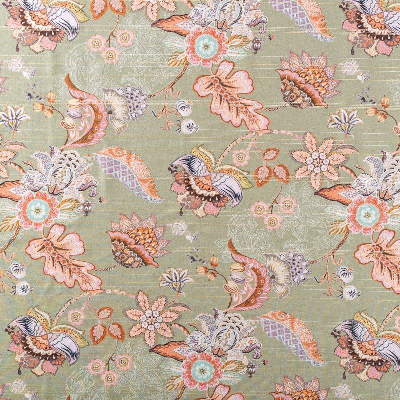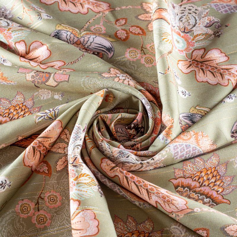 Итальянская плательно-блузочная вискоза с фантазийным цветочным принтом на фоне цвета шалфея декорирована тонкой люрексовой полоской. Ткань очень пластичная, отлично драпируется и струится, мягкая и приятная на ощупь, не просвечивает. Прекрасно подойдет для пошива платья, топа, блузки, юбки.