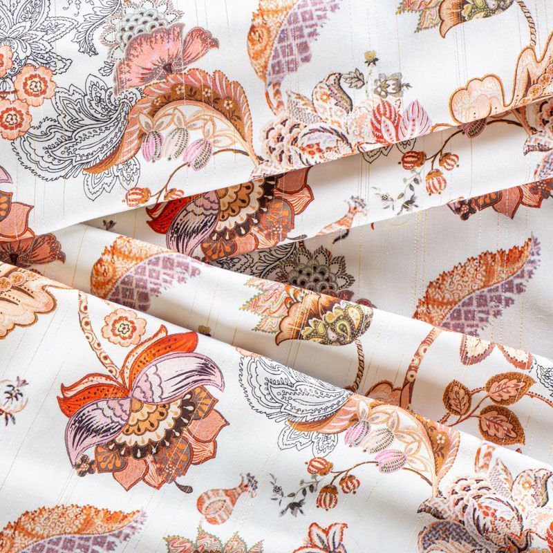 Итальянская плательно-блузочная вискоза с фантазийным цветочным принтом на молочном фоне декорирована тонкой люрексовой полоской. Ткань очень пластичная, отлично драпируется и струится, мягкая и приятная на ощупь, не просвечивает. Прекрасно подойдет для пошива платья, топа, блузки, юбки.