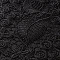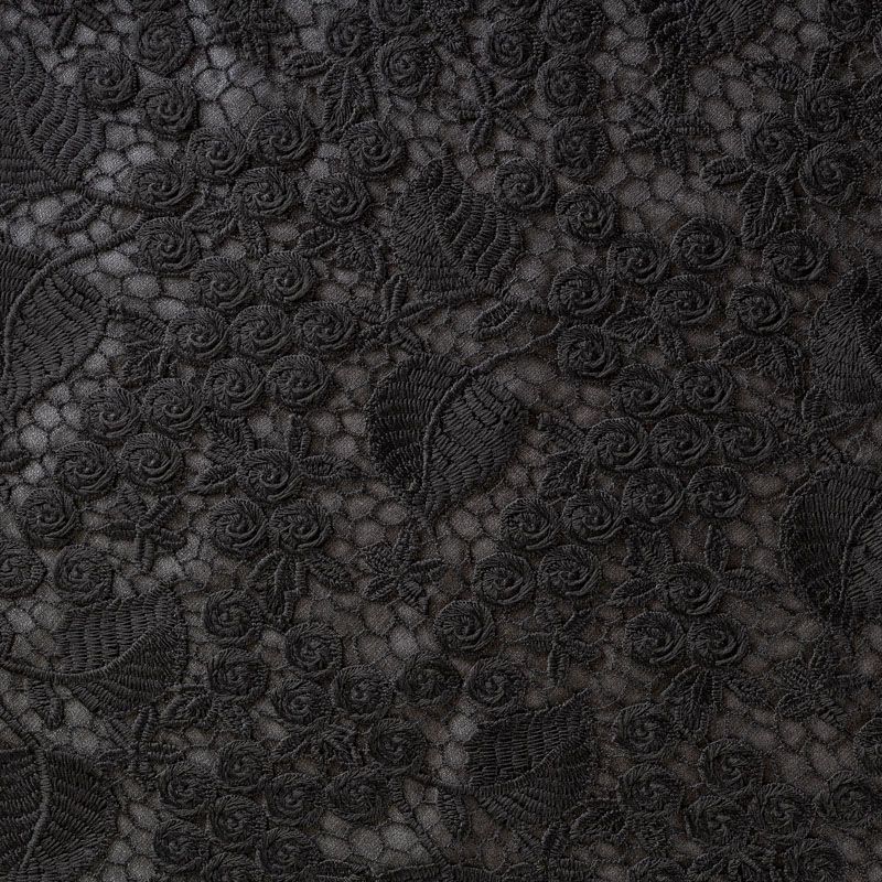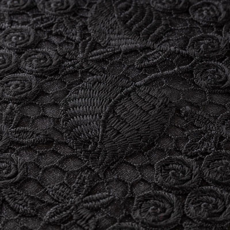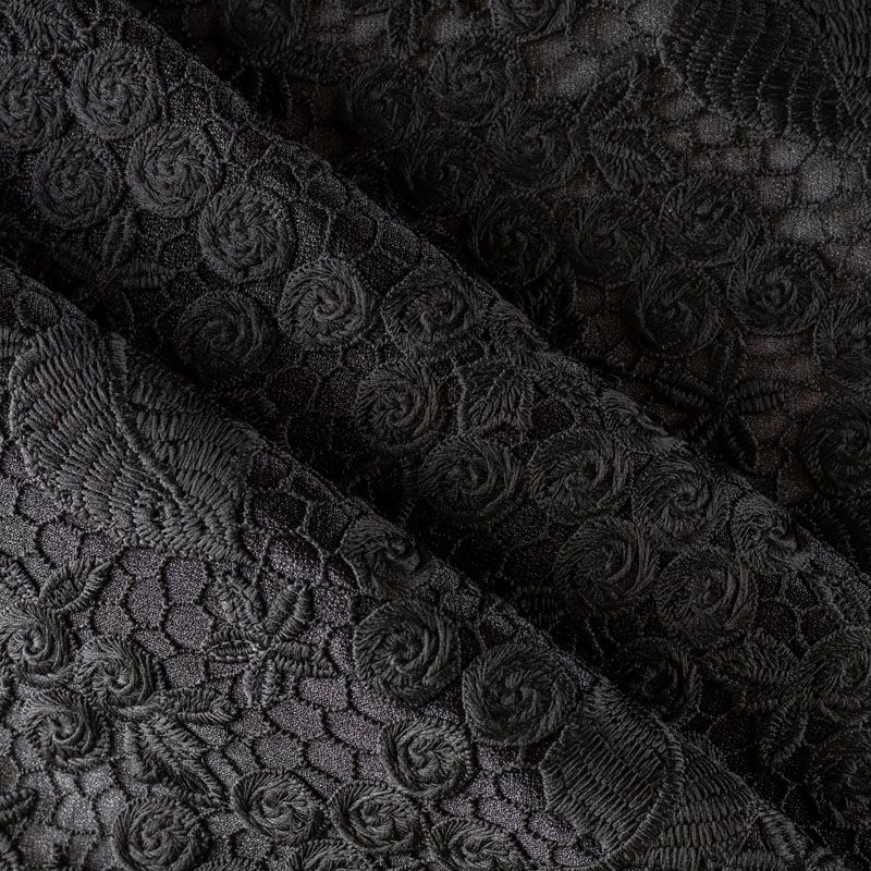 Очень эффектная вышивка на сетчатной основе черного цвета с мелкой ячейкой, мягкая и пластичная. Вышивка с флористическим орнаментом в тон основе, плотная, расположена по всем полотну. Ткань приятная к телу, не колется, не цепляется. Идеальна для эффектных вечерних нарядов и для повседневного  образа в виде платья-футляра, топа, блузки, летнего жакета, кардигана, брюк или шорт. Требуется подклад.
