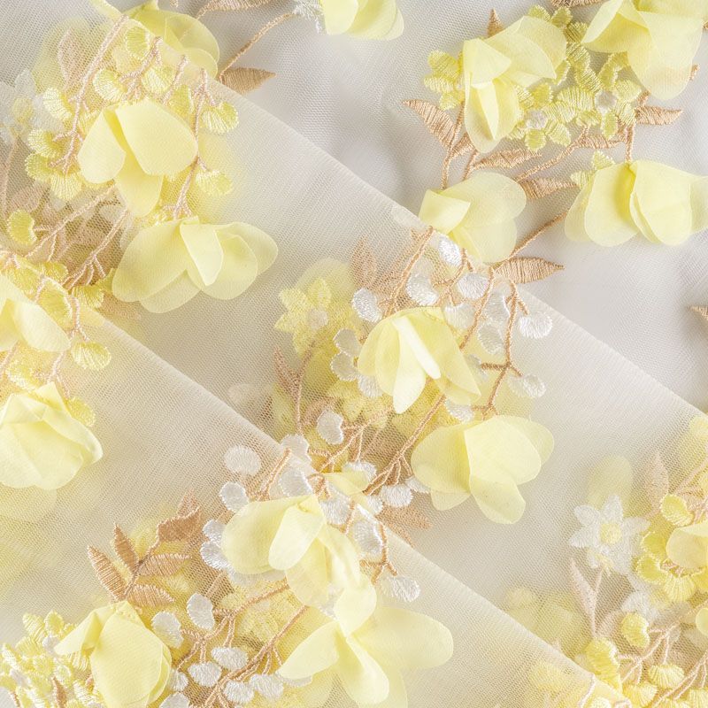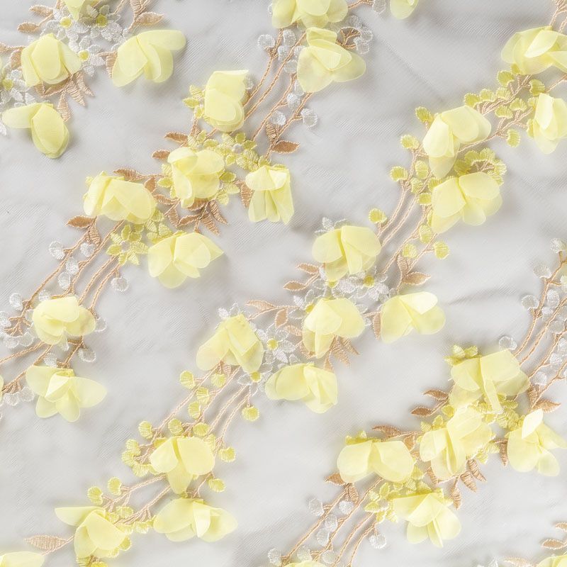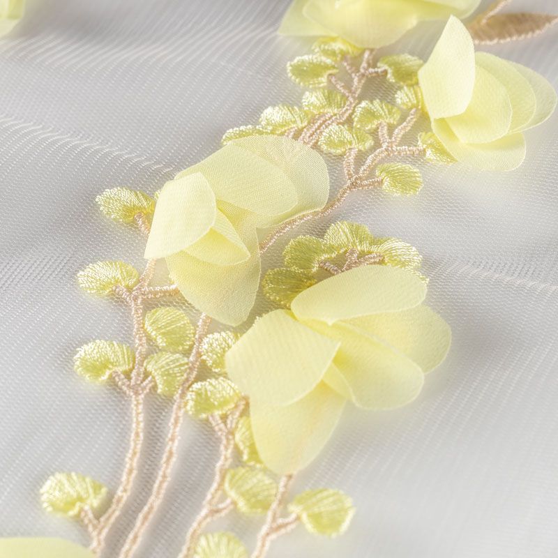 Необычная вышивка на сетке с 3D эффектом - воздушный, пластичный, трогательный купон на сетке основе молочного цвета. Оттенок смотрится благородно, а цветы из нежного шифона светло-лаймового цвета подвижны и создают весеннее настроение.