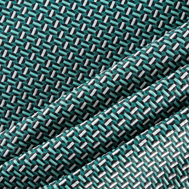 Итальянский фактурный жаккардовый купон в бело-зеленых оттенках с мелким геометрическим дизайном. По нижнему краю купона расположены контрастные полосы. Ткань отлично держит форму, тянется за счет эластана в составе, практически не мнется.