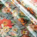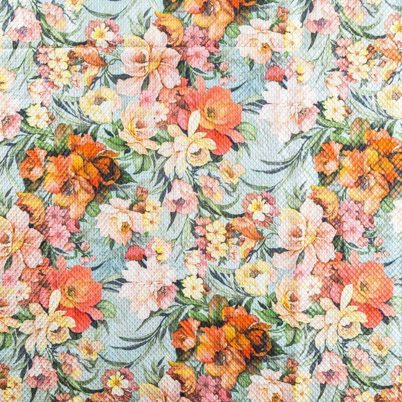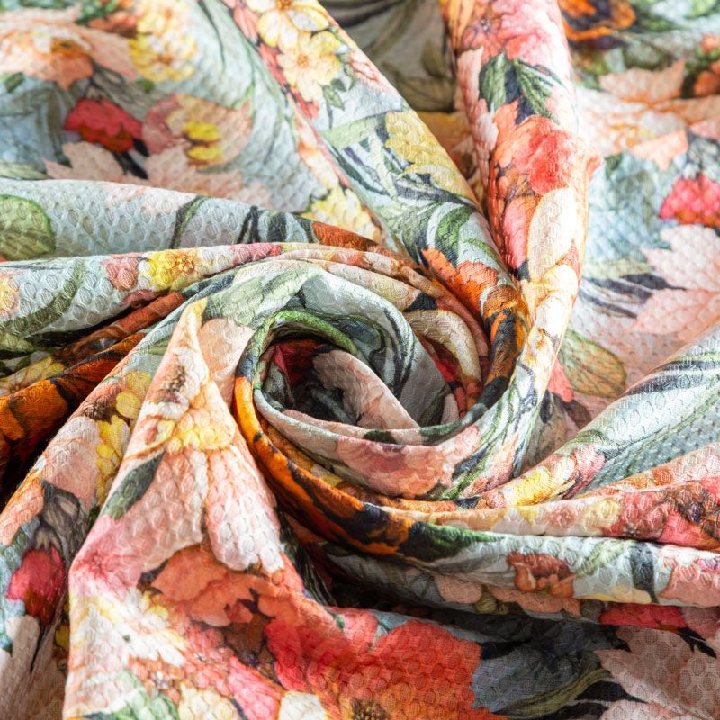 Итальянская хлопковая ткань с фактурным жаккардовым узором и цветочным принтом голубого оттенка. Ткань легкая, мягкая и приятная на ощупь, не мнется, тянется за счет эластана в составе, держит форму и ложится красивыми складками. Идеально подходит для пошива нарядных платьев, сарафанов и костюмов весенне-летнего сезона.