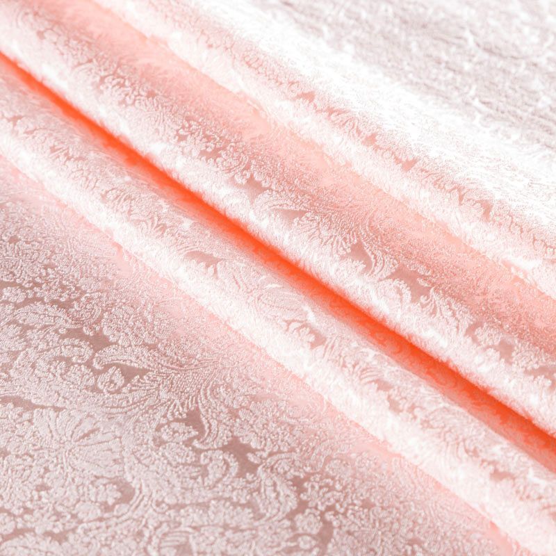 Итальянский жаккард с красивым орнаментом оттенка розового жемчуга. Ткань легкая, но плотная, поверхность со сдержанным блеском, объемная и текстурная, хорошо драпируется и держит форму, тянется за счет эластана в составе, не просвечивает. Подойдет для пошива нарядных вечерних костюмов, корсетов, платьев-футляров, жакетов, топов, легких пальто, бомберов, юбок или шорт.