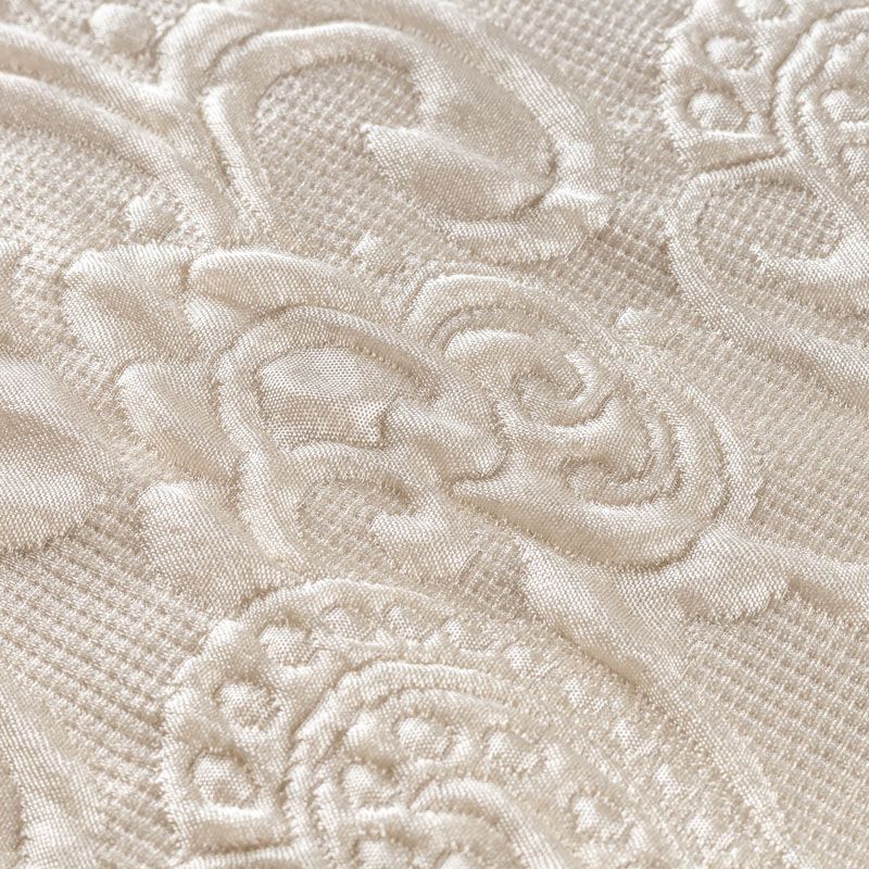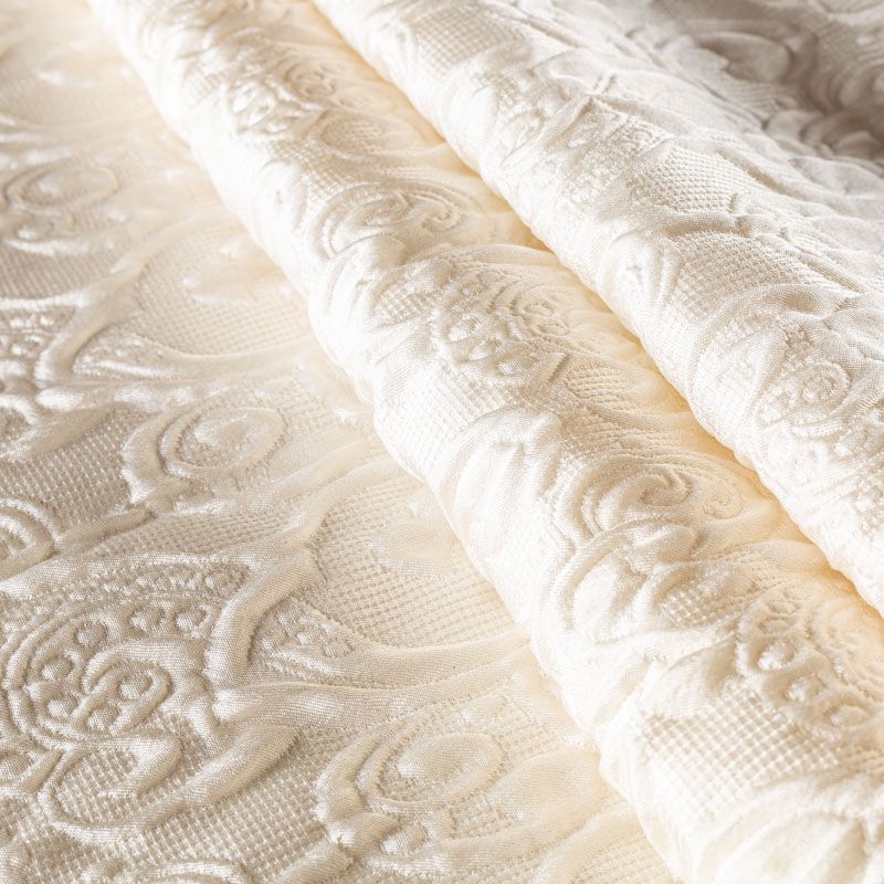 Нарядный шелковый итальянский жаккард молочного оттенка. Ткань легкая, поверхность со сдержанным блеском объемная и фактурная, хорошо драпируется, не тянется и не просвечивает. Подойдет для пошива нарядных вечерних костюмов, платьев-футляров или стиле Dior, жакетов, топов, летних пальто, юбок или шорт.