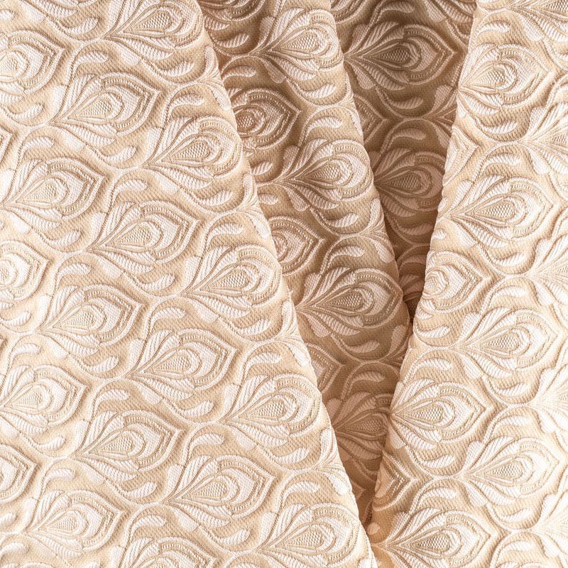 Благородный светло-бежевый фон итальянского жаккарда  дополнен объемным фантазийным узором жемчужно-молочного оттенка. Ткань легкая, средней плотности, не просвечивает, не тянется. Хорошо держит форму и драпируется. Идеально подойдет для платьев различных силуэтов, костюмов, жакетов, юбок, шорт, легких пальто.