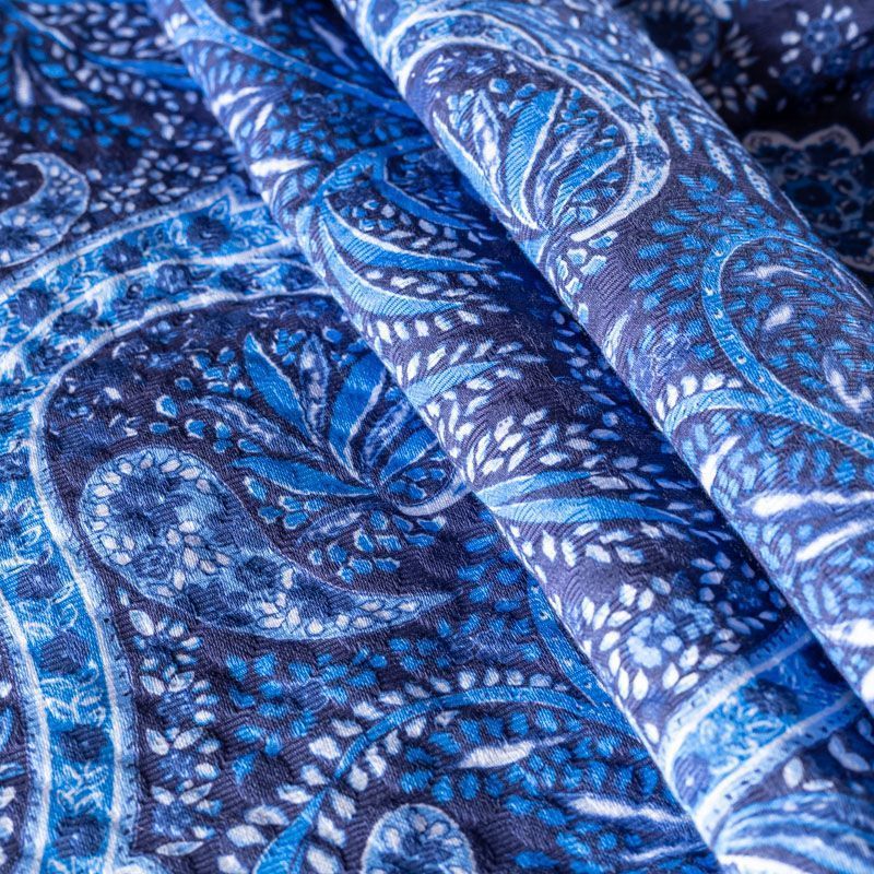 Итальянский хлопковый жаккард с принтом пейсли в синих ярких оттенках. Ткань средней плотности, поверхность матовая, объемная, фактурная, хорошо драпируется и держит форму, не тянется, не просвечивает. Подойдет для пошива костюмов, платьев-футляров, жакетов, топов, летних пальто, бомберов, юбок или шорт.