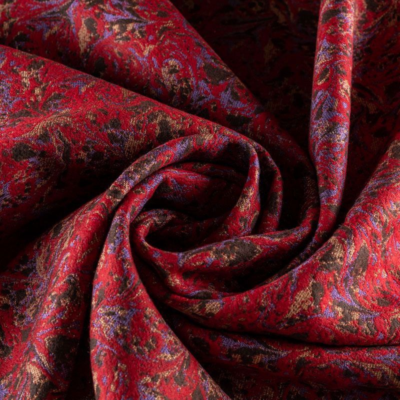Итальянский пальтовый шерстяной жаккард красного цвета с пестрым узором, который создает оригинальный объемный эффект. Фактура ткани напоминает тканое полотно, ткань плотная, практичная и прочная. Она хорошо держит форму, небольшое количество эластана повышает ее растяжимость. Отлично подойдёт для пошива утепленного или легкого пальто, жилета, жакета, юбки.
