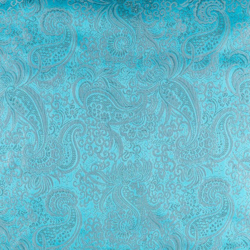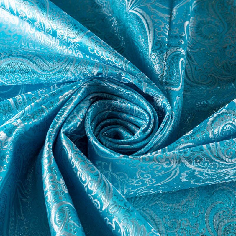 Насыщенная ткань плотного переплетения с декоративной поверхностью, покрытая сложным орнаментом из блестящих нитей. Ткань легкая, отлично драпируется, держит форму, отличается прочностью, долговечностью, износостойкостью и простотой в уходе, не смотря на свою высокую декоративность. Нарядность ткани придает золотая люрексовая нить. Подходит для пошива юбок, платьев, топов, сценических костюмов.