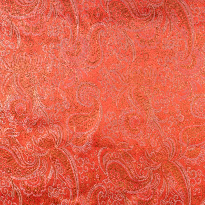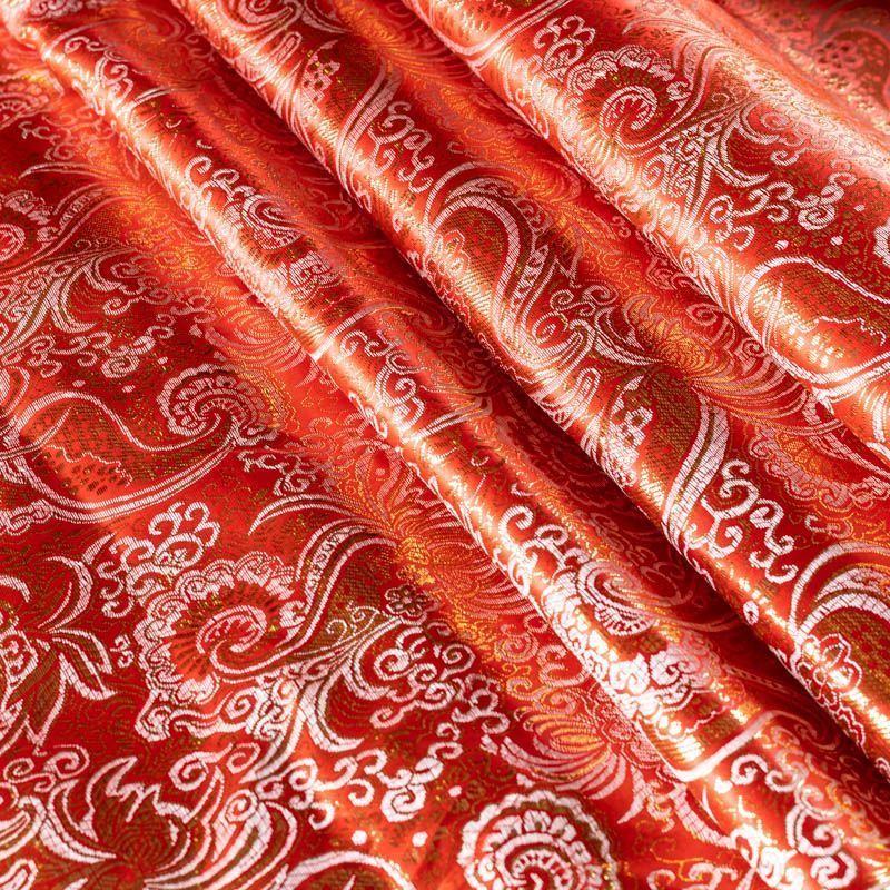 Насыщенная ткань плотного переплетения с декоративной поверхностью, покрытая сложным орнаментом из блестящих нитей. Ткань легкая, отлично драпируется, держит форму, отличается прочностью, долговечностью, износостойкостью и простотой в уходе, не смотря на свою высокую декоративность. Нарядность ткани придает золотая люрексовая нить. Подходит для пошива юбок, платьев, топов, сценических костюмов.